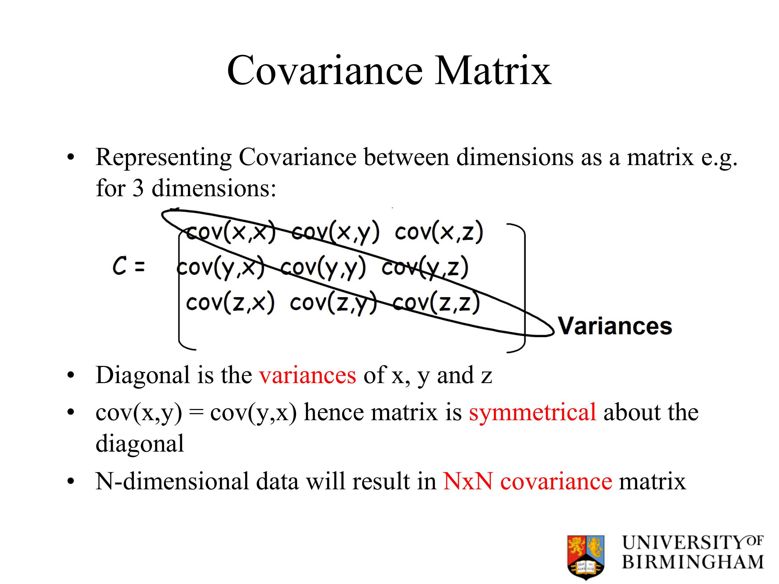 - N 维数据将产生 NxN 协方差矩阵。